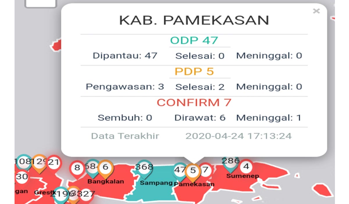 Menurut Pelaksana Tugas (Plt) Kepala Dinas Kesehatan (Dinkes) Pamekasan Ahmad Marsuki di Pamekasan, Kamis (24/4/2020) malam, data sebaran warga Madura yang terkonfirmasi positif COVID-19 itu, sesuai dengan data terbaru yang dirilis Satgas Penanggulangan COVID-19 Provinsi Jawa Timur.
