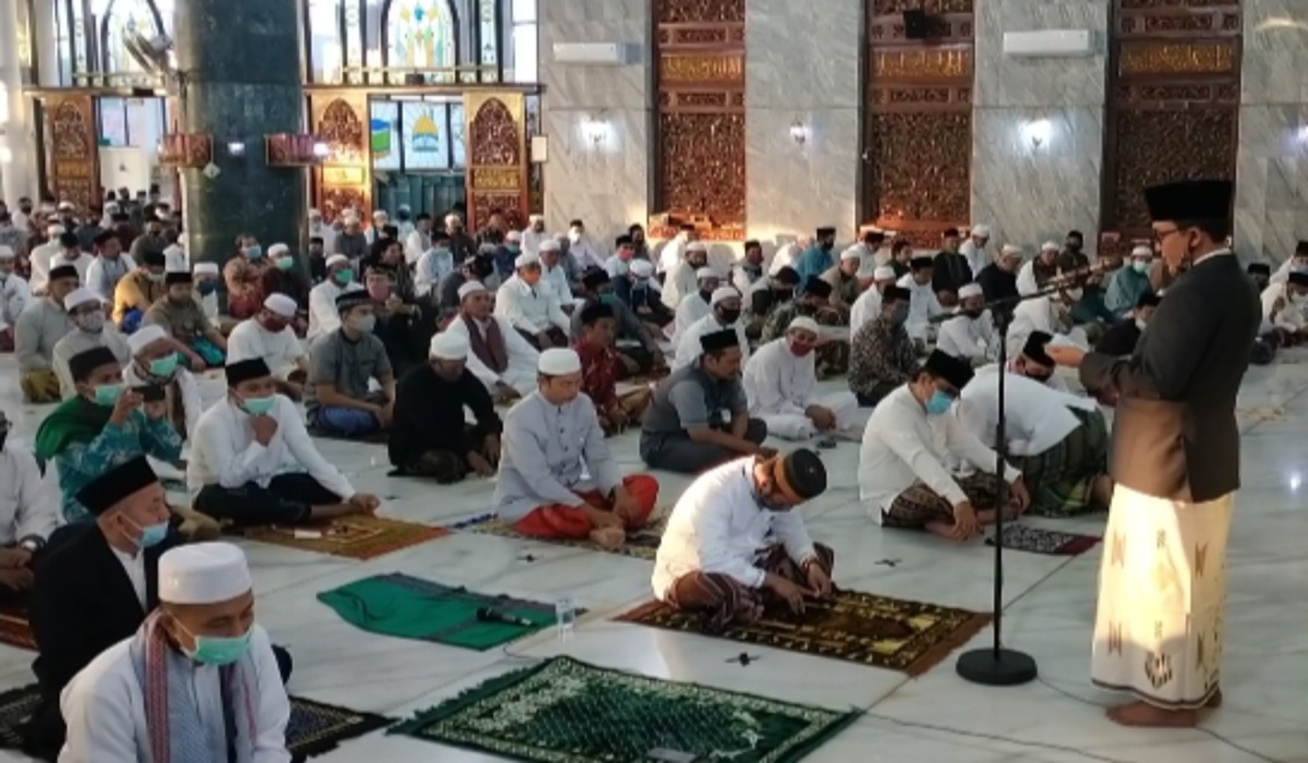 Pelaksanaan shalat dengan menerapkan protokol kesehatan dan menjaga jarak. Jamaah yang datang ke masjid itu dilakukan pengecekan suhu tubuh terlebih dahulu oleh petugas dan diminta untuk mencuci tangan menggunakan sabun dengan air mengalir.