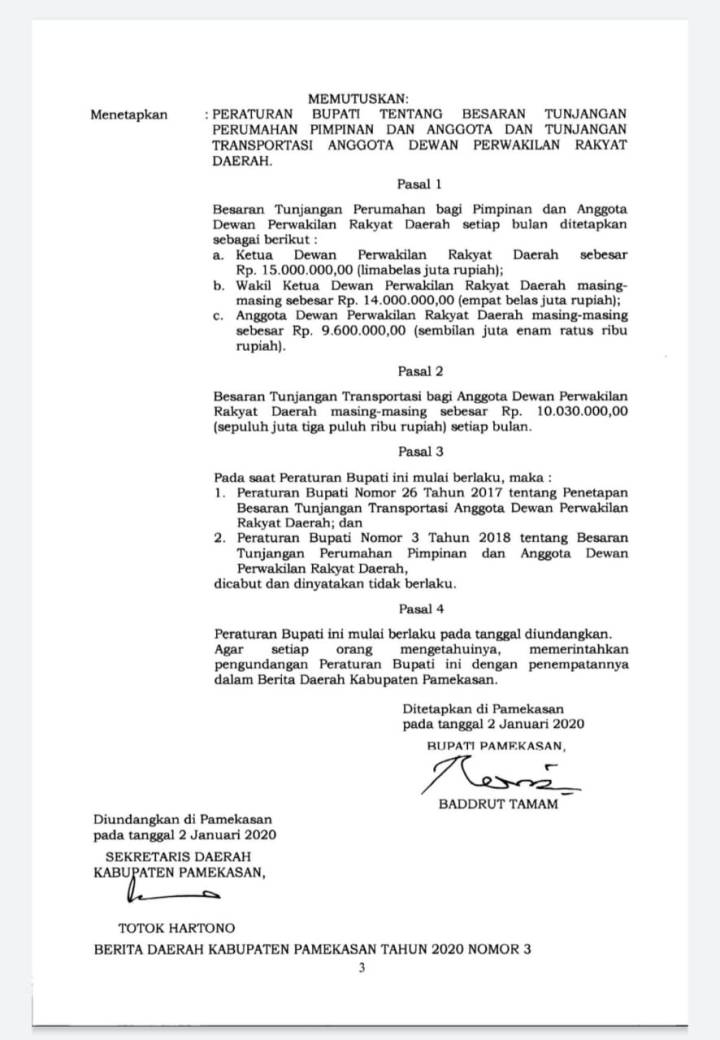 Khusus Ketua DPRD Pamekasan, nilai tunjangan perumahan sebesar Rp15.000.000 per bulan, dan Wakil Ketua DPRD Pamekasan sebesar Rp14.000.000 per bulan. Besaran tunjangan transportasi dan perumahan para anggota DPRD Pamekasan ini, sebagaimana tertuang dalam Peraturan Bupati (Perbup) Nomor: 3 Tahun 2020 tentang Besaran Tunjangan Perumahan Pimpinan dan Anggota dan Tunjangan Transportasi Anggota Dewan Perwakilan Rakyat Daerah.