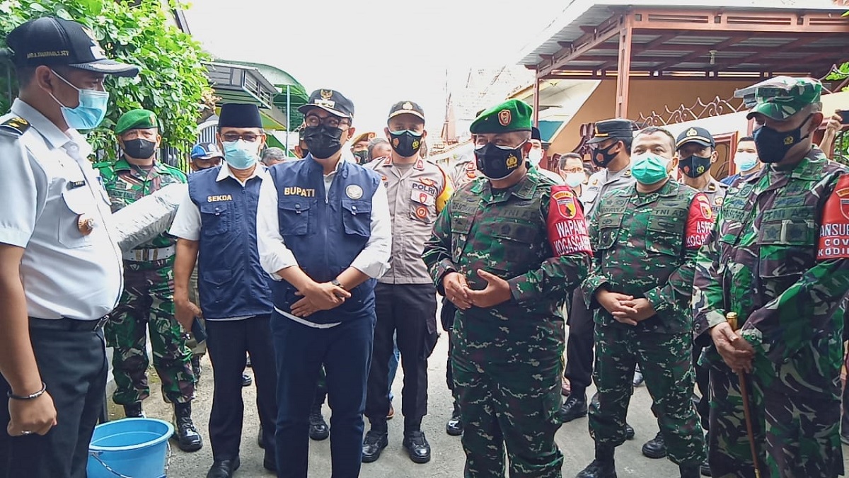 PAMEKASAN HEBAT – Bupati Pamekasan Baddrut Tamam, mendampingi Kasdam V/Brawijaya Brigjen TNI Agus Setiawan, meninjau posko Pemberlakuan Pembatasan Kegiatan Masyarakat (PPKM) skala mikro di Kelurahan Bugih, Kecamatan Kota Pamekasan, Rabu (24/02/2021).