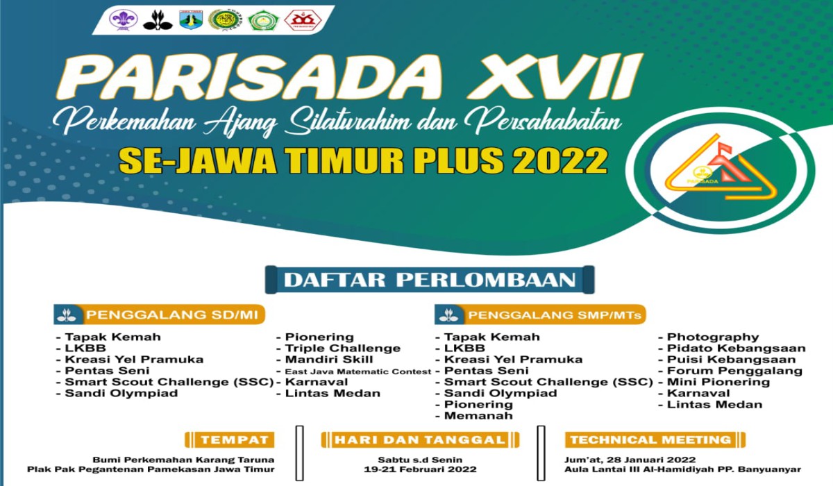 PAMEKASAN HEBAT – Perkemahan Ajang Silaturahim dan Persahabatan (PARISADA XVII) Se-Jawa Timur Plus 2022 dengan tema “Menanamkan Bakat Potensial, Aktif dan Bersinergi” untuk Tingkat Penggalang SD/MI dan Penggalang SMP/MTs Se-Jawa Timur Plus 2022 bakal digelar pada tanggal 19 hingga 21 Februari 2022.
