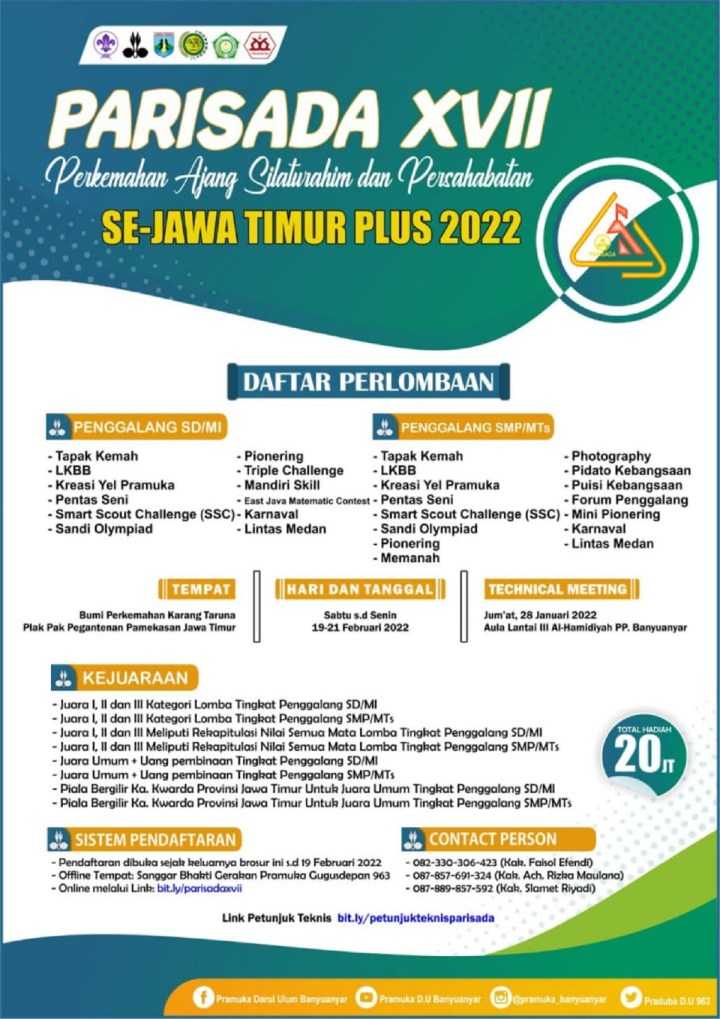 Info pendukung lainnya mengenai kegiatan ini bisa diakses di akun media sosial kami di akun facebook: Pramuka Darul Ulum Banyuanyar, Instagram: @pramuka_banyuanyar, Twitter: Praduba D.U 963, dan di kanal Youtube: Pramuka D.U Banyuanyar.