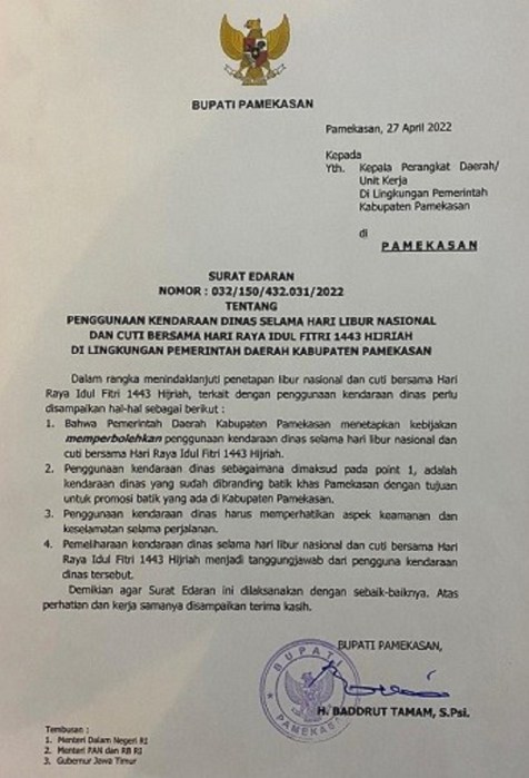 Menurut Sekretaris Daerah (Sekda) Pemkab Pamekasan Totok Hartono, kebijakan itu sebagaimana tertuang dalam Surat Edaran Bupati No. 032/150/432.031/2022 tentang Penggunaan Kendaraan Dinas Selama Libur Nasional dan Cuti Bersama Hari Raya Idul Fitri 1443 Hijriah di Lingkungan Pemkab Pamekasan.