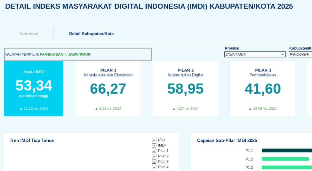 PAMEKASAN – Angka Indeks Masyarakat Digital Indonesia (IMDI) untuk Kabupaten Pamekasan naik 11,13 dari sebelumnya 42,21 menjadi 53,34 pada 2025 ini, sesuai rilis Kementerian Komunikasi dan Digital Republik Indonesia (Komdigi-RI).
